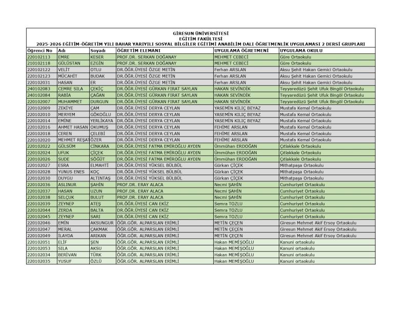 Sosyal Bilgiler Eğitimi Ana Bilim Dalı 2025-2026 Eğitim-Öğretim Yılı Bahar Yarıyılı Uygulama Grupları